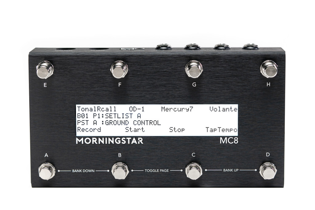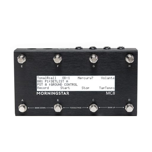A Morningstar MC8 egy professzionális, mégis pedalboard-barát MIDI lábvezérlő azoknak, akik egyetlen központi egységből szeretnék irányítani multieffektjüket, modellezőjüket, erősítőjüket vagy akár szoftveres rigjüket. A nagyobb, 4 soros kijelző valós időben mutatja a bankneveket, aktív preseteket, MIDI clock tempót és az expression állását, a nyolc lábkapcsoló pedig gyors, színpadbiztos vezérlést ad. Bankonként két oldal érhető el, így összesen 30 bankban 16 teljesen programozható preset áll rendelkezésre, oldalváltással (B+C) pillanatok alatt.